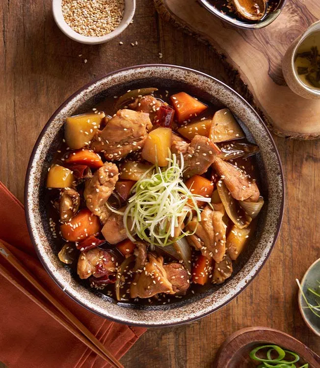 Delikatne udka z kurczaka duszone z warzywami w Sosie sojowym Kikkoman i wykończone Olejem sezamowym Kikkoman. Gęsty, lśniący sos i chrupiąca posypka z sezamu i dymki nadają temu daniu charakterystyczny koreański smak.