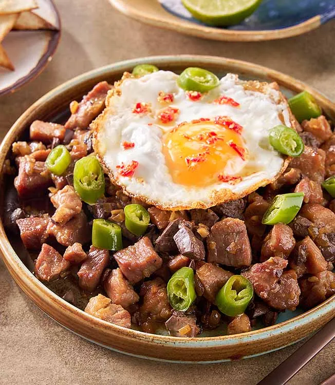 Klasyka filipińskiej kuchni ulicznej w nowoczesnej odsłonie: soczysta karkówka wieprzowa i wątróbka duszone w Sosie sojowym Kikkoman o obniżonej zawartości soli z cebulą, chili i majonezem dla uzyskania kremowej konsystencji i pikantnej głębi smaku.