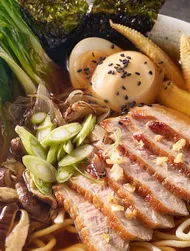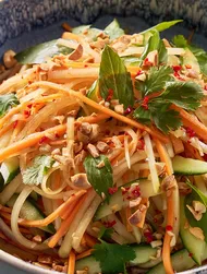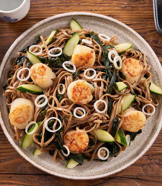 Soczyste i złociste grillowane przegrzebki podawane na makaronie soba z chrupiącym ogórkiem i wodorostami wakame. Lekkie i eleganckie danie fusion doprawione Sosem Poke Kikkoman.