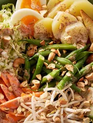 Nałóż makaron i warzywa na talerze. Na wierzchu ułóż grillowane przegrzebki i posyp dymką.