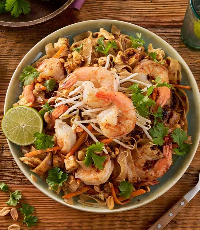 Sycący Pad Thai z krewetkami, tofu i świeżymi warzywami w aromatycznym sosie tamaryndowym na bazie Sosu sojowego Kikkoman o obniżonej zawartości soli. Delikatnie słodko-kwaśne, głęboko umamiczne i rozkosznie chrupiące danie.