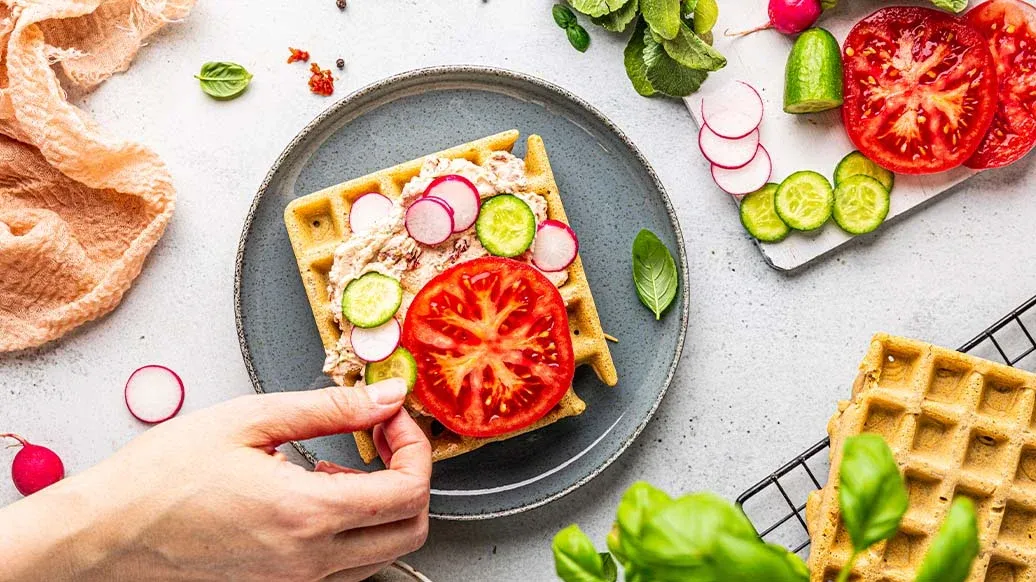 Bezglutenowe gofry gryczane z pomidorami i serem