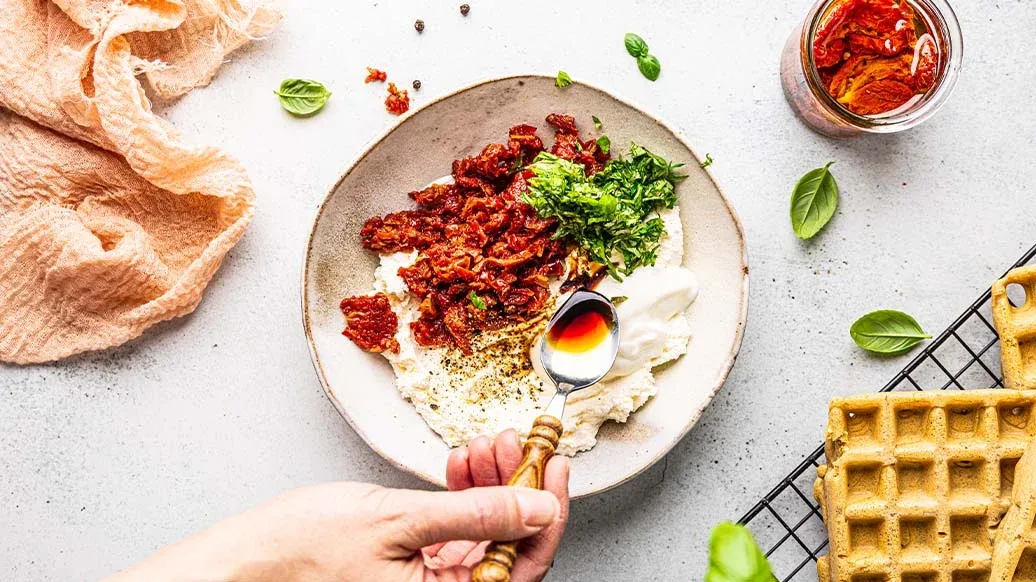 Pyszne bezglutenowe gofry gryczane z suszonymi pomidorami, bazylią i serkiem śmietankowym. Z chrupiącą skórką i miękkim, puszystym środkiem, są łatwe do przygotowania i idealne do rozkoszowania się ich smakiem.