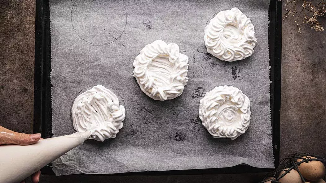 Pianę przełóż do rękawa cukierniczego i na blaszce wyłożonej papierem do pieczenia uformuj gniazdka.