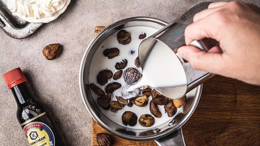 400 g nieugotowanych kasztanów jadalnych – 40 ml rumu – 1 laska wanilii – 400 ml mleka – 2 łyżki cukru pudru – 1 łyżka Naturalnie warzony sos sojowy Kikkoman