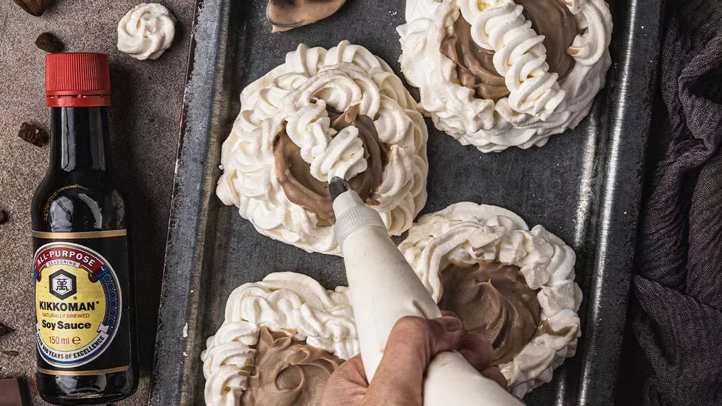 Słodycz chrupiącej bezy przełamana kremowym słono-słodkim musem z kasztanów jadalnych, wyrazistym, dzięki dodatkowi naturalnie warzonego sosu sojowego Kikkoman. Do tego chrupiące orzechy. Takie połączenie smakuje jak niebo!