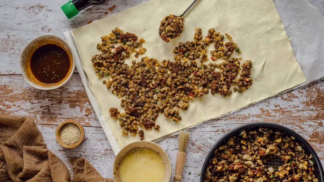 Pyszne połączenie chrupiącego ciasta francuskiego z aromatycznym farszem z zielonej soczewicy i suszonych pomidorów. Delikatne i jednocześnie pełne smaku, danie z tego przepisu to doskonały pomysł na przekąskę lub lekki posiłek. Ostry akcent, uzyskany dzięki dodatkowi papryczki chili, spodoba się fanom pikantnej kuchni.
