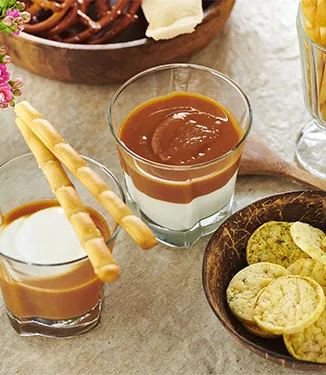 Przed podaniem najpierw wlej kwaśną śmietanę (lub bitą śmietanę) do małej miski lub szklanki. Następnie dodaj dip z batatów i podawaj.