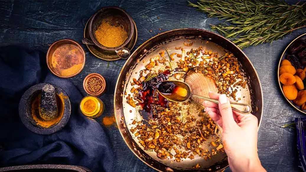 Rozdrobnij nasiona kolendry w moździerzu, a następnie wymieszaj z kurkumą, imbirem i kminem rzymskim. Dodaj przyprawy na patelnię z kroku 2 i smaż przez około 1 minutę. Dodaj Sos sojowy Kikkoman, wlej bulion i wymieszaj, a następnie przelej całość do naczynia z mięsem.