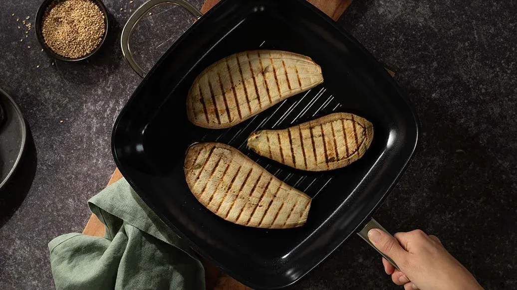 Bakłażana pokrój wzdłuż na plastry o grubości nieco mniejszej niż 1 cm. Smaż przez 8-10 minut na lekko naoliwionym grillu, patelni grillowej lub patelni z nieprzywierającą powłoką bez dodatku oleju. Obciąż bakłażana czymś lekkim, np. pokrywką patelni. Upraż sezam na małej, suchej patelni, często mieszając, aż się zrumieni.