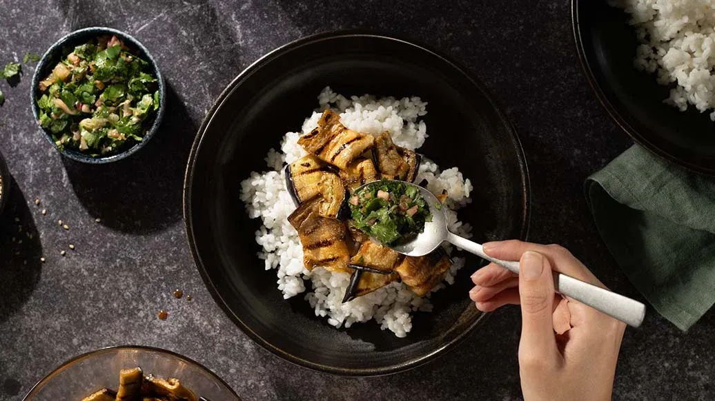 Nałóż ryż do dwóch misek jak przy chirashi sushi i ułóż na wierzchu paski bakłażana. Posyp sezamem i podawaj z salsą limonkową.