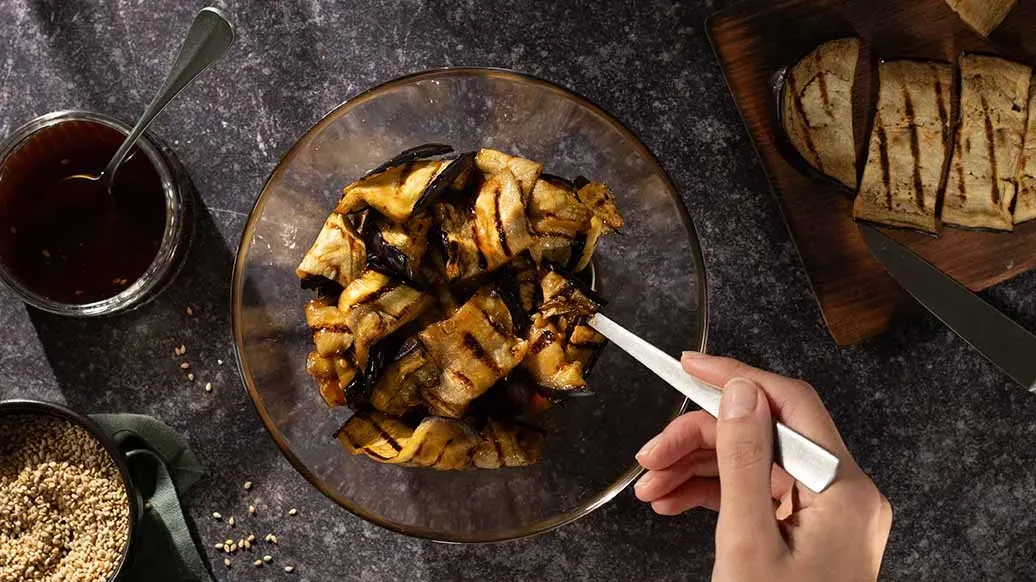 Pokrój bakłażana w paski o długości 3 cm i wymieszaj w misce z Sosem Teriyaki BBQ w stylu koreańskim Kikkoman.