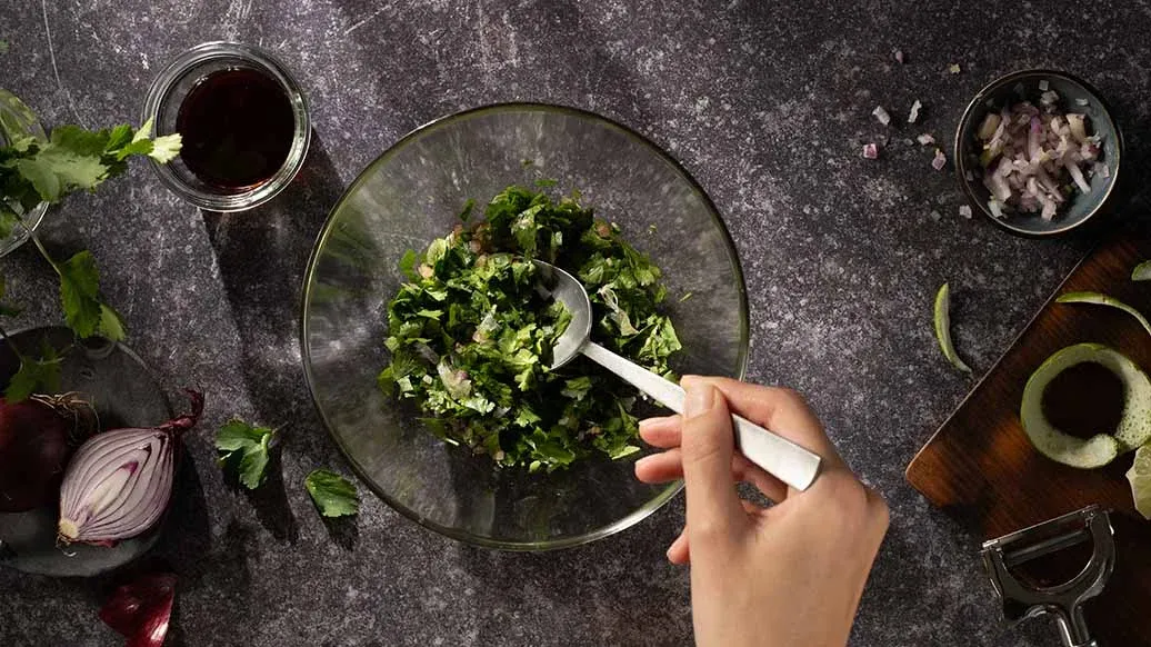 Zacznij od przygotowania salsy. W tym celu obierz limonkę i pokrój miąższ w kostkę. Wymieszaj z cebulą, kolendrą i Cytrusowym sosem Ponzu Kikkoman.