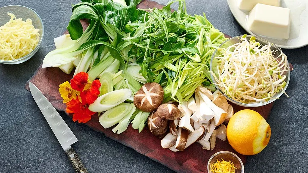 200 g grzybów (np. enoki, boczniak królewski, shiitake) – 200 g rukoli – 150 g kiełków fasoli – 2 pory – 2 główki pak choi – 300 g tofu