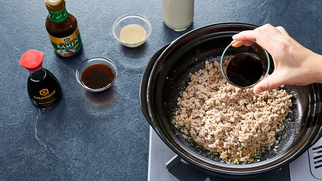 Rozgrzej Olej sezamowy Kikkoman w garnku. Dodaj posiekany czosnek, imbir, posiekaną białą część pora z kroku 1, pieprz syczuański i papryczkę chili i mieszaj, aż uwolni się aromat. Dodaj mielone mięso i smaż, aż się zrumieni. Dodaj tahini, Sos sojowy Kikkoman, Bazę do zupy ramen Kikkoman, sól i mleko sojowe. Dobrze wymieszaj.
