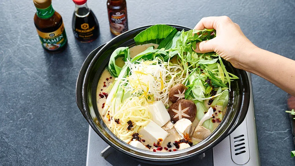 2 łyżki Olej z prażonych nasion sezamu Kikkoman – 1 łyżka czosnku, posiekanego – 1 łyżka imbiru, posiekanego – chopped white part of the leek from step 1 – 1 łyżeczka mielonego pieprzu syczuańskiego – ½ łyżeczki suszonej, pokruszonej papryczki chili – 300 g mielonego mięsa, dowolnego rodzaju – 2 łyżki tahini – 3 łyżki Skoncentrowana Baza do Zupy Makaronowej w Stylu Japońskim - Ramen Smak Shoyu (sos Sojowy) Kikkoman – 2 łyżki Naturalnie warzony sos sojowy Kikkoman – 2 łyżeczki soli – 1 l niesłodzonego mleka sojowego