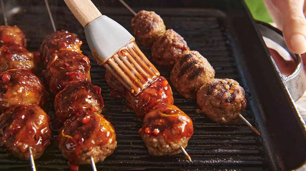 Pulpety posmaruj olejem przy pomocy pędzelka. Grilluj pulpety na rozgrzanym ruszcie po ok. 5 min z każdej strony. Po tym czasie pulpety posmaruj z każdej strony glazurą i ponownie zgrilluj.