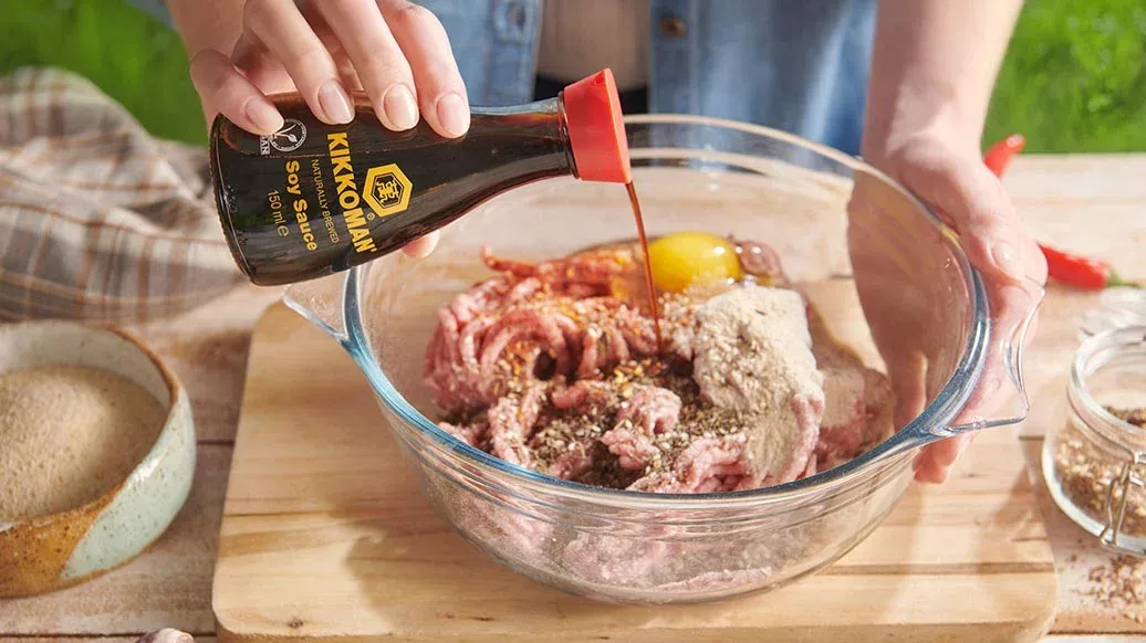 Mięso mielone wymieszaj z jajkiem, Sosem sojowym Kikkoman i przyprawami. Na końcu dodaj bułkę tartą i ponownie wymieszaj. Mięso powinno dać się formować.