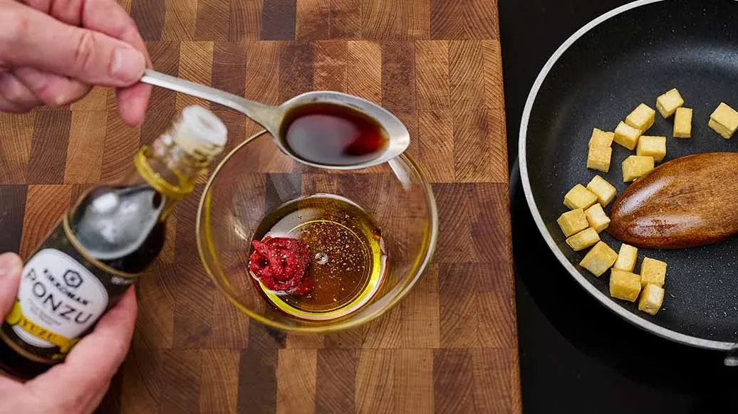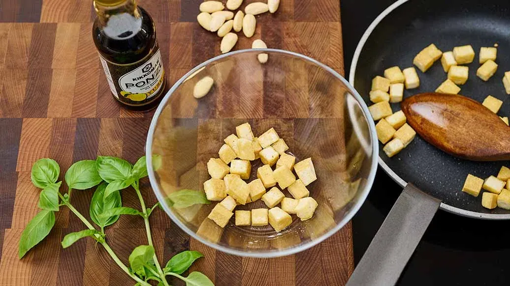 30 ml oleju roślinnego – 90 g naturalnego tofu, pokrojonego w kostkę – 15 g świeżej bazylii, posiekanej – 20 g obranych migdałów – 30 ml Kikkoman Ponzu - mieszanka sosu sojowego, octu i soku z owoców yuzu – ¼ łyżeczki świeżo zmielonego pieprzu