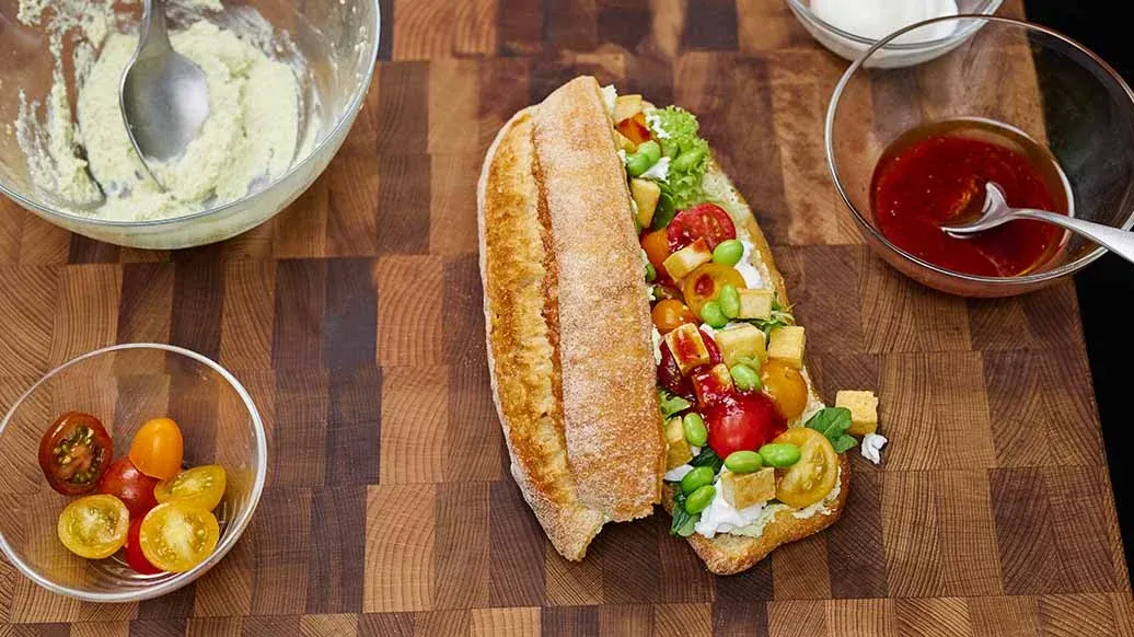 Ciabattę przekrój wzdłuż na pół i posmaruj obie połówki pesto z tofu. Na dolnej połowie ułóż liście sałaty, a następnie porwaną na kawałki burratę. Dodaj pomidorki koktajlowe, kostki tofu i edamame. Skrop winegretem yuzu, a następnie przykryj górną połówką. Przekrój w poprzek na pół i podawaj.