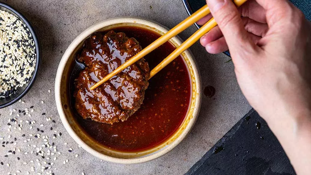 Burger z delikatnej bułeczki bao z surówką z kimchi i czerwonej kapusty, majonezowym sosem kimchi oraz soczystym kotletem wołowym otulonym Sosem Teriyaki z czosnkiem Kikkoman. Perfekcyjna kompozycja smaków w koreańskim stylu.