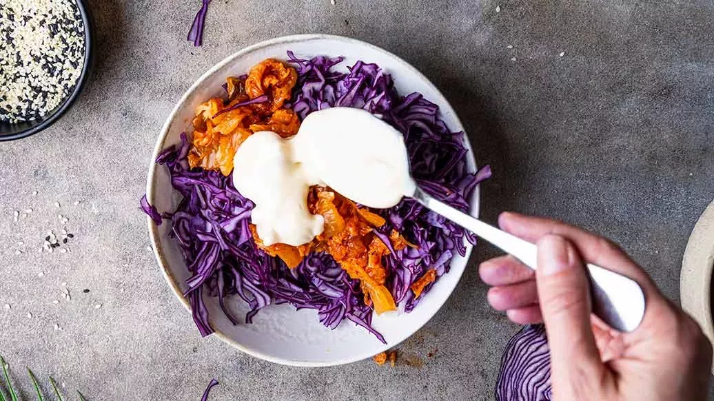 100 g kapusty czerwonej – 50 g kimchi – 1 łyżeczka octu ryżowego – 1 łyżeczka miodu – 1 łyżka majonezu