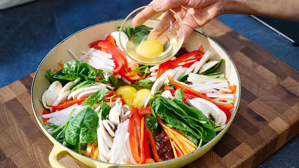Wbij jajka w środek garnka. Postaw garnek na średnim ogniu i równomiernie zalej wodą wszystkie składniki. Gdy jajka i warzywa będą ugotowane, delikatnie wymieszaj i podawaj.