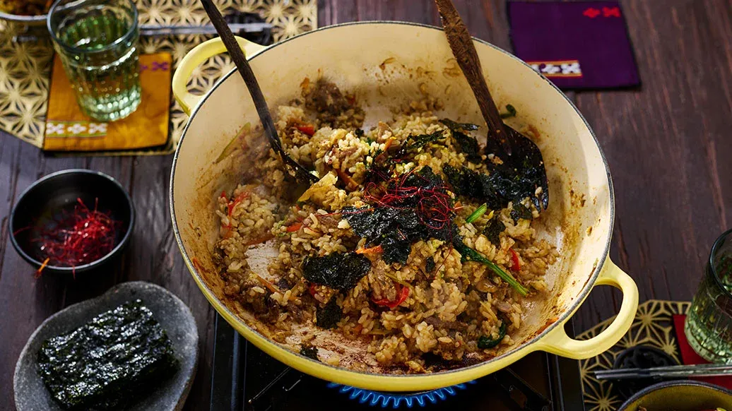 Rozgrzej na patelni Olej sezamowy Kikkoman. Dodaj ugotowany ryż i Sos Teriyaki z sezamem Kikkoman. Smaż, aż się zagrzeje. Podawaj smażony ryż jako dodatek do gorącego kociołka.