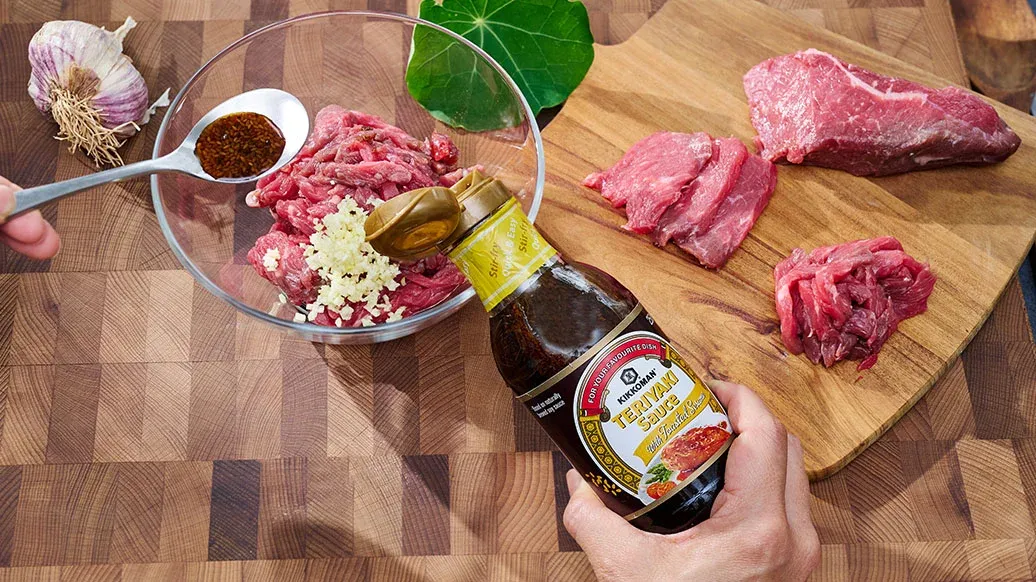 300 g cienko pokrojonej wołowiny lub wieprzowiny (możesz też użyć mielonej wołowiny lub tofu) – 1 ząbek czosnku, starty – 120 ml Sos Teriyaki z tostowanym ziarnem sezamowym Kikkoman