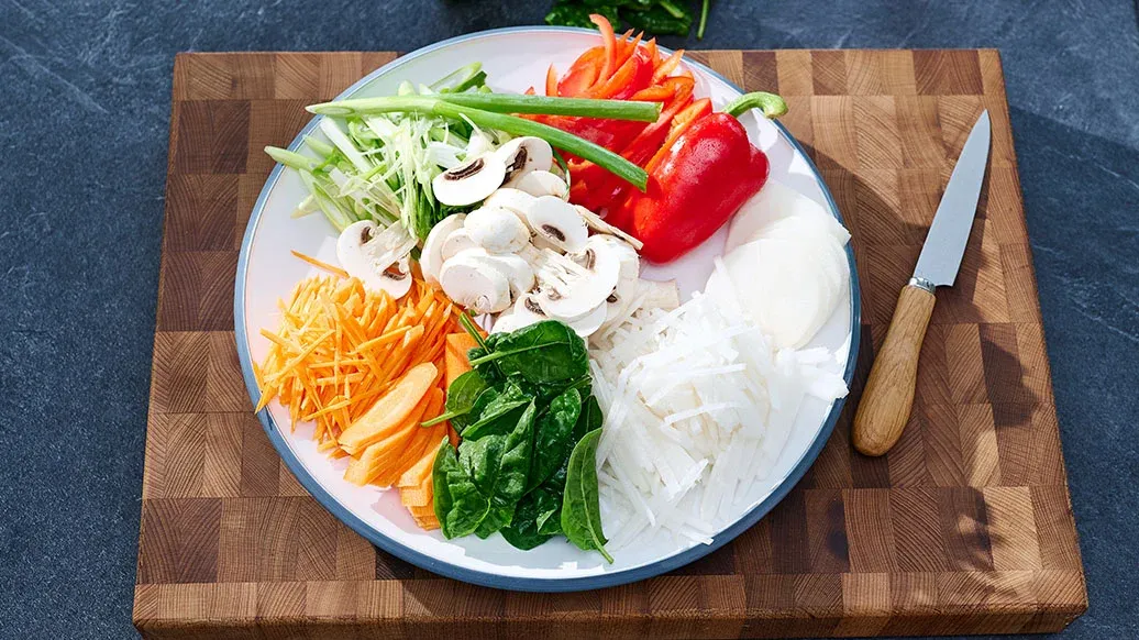 Rzodkiew i marchewkę pokrój w cienkie słupki o długości 6 cm. Dymkę, szpinak i paprykę pokrój w paski o długości 6 cm. Grzyby pokrój w plasterki o grubości 5 mm.
