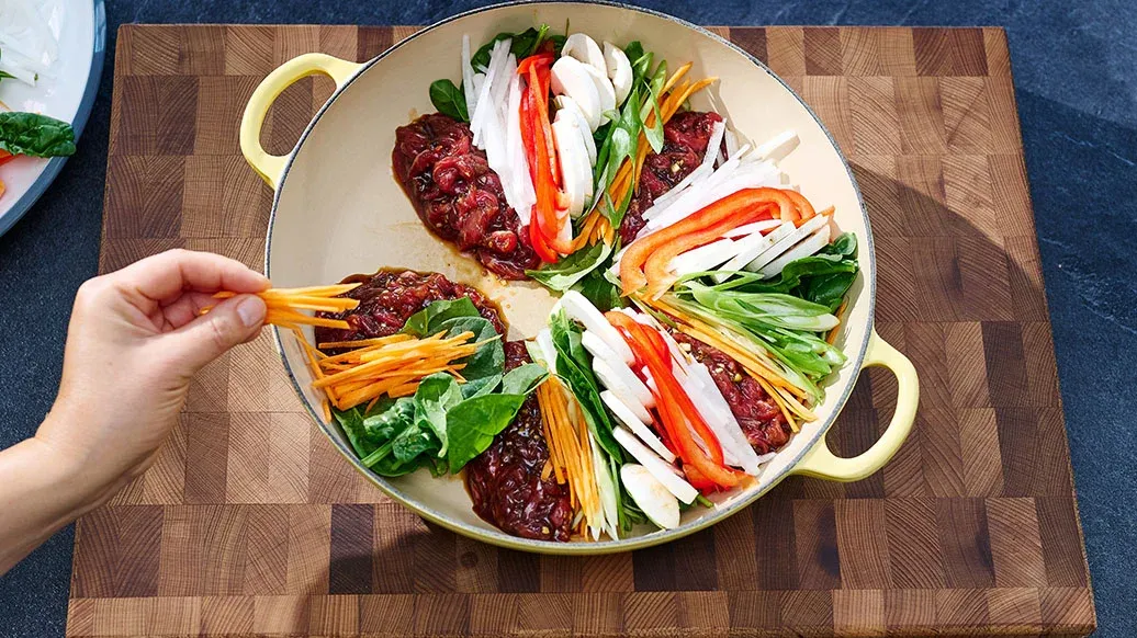 Wlej Olej sezamowy Kikkoman do garnka. Podziel zamarynowane mięso z kroku 1 na 5 porcji i ułóż je w okręgu, zachowując odstępy. Warzywa z kroku 2 rozłóż równomiernie wokół mięsa, tworząc ten sam okrągły wzór.