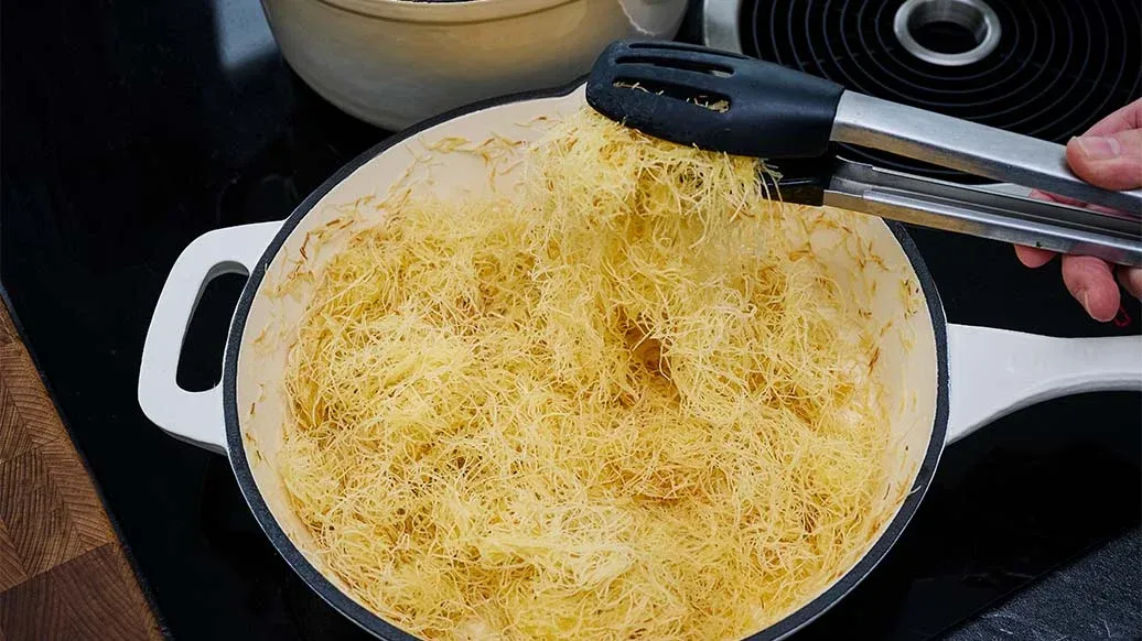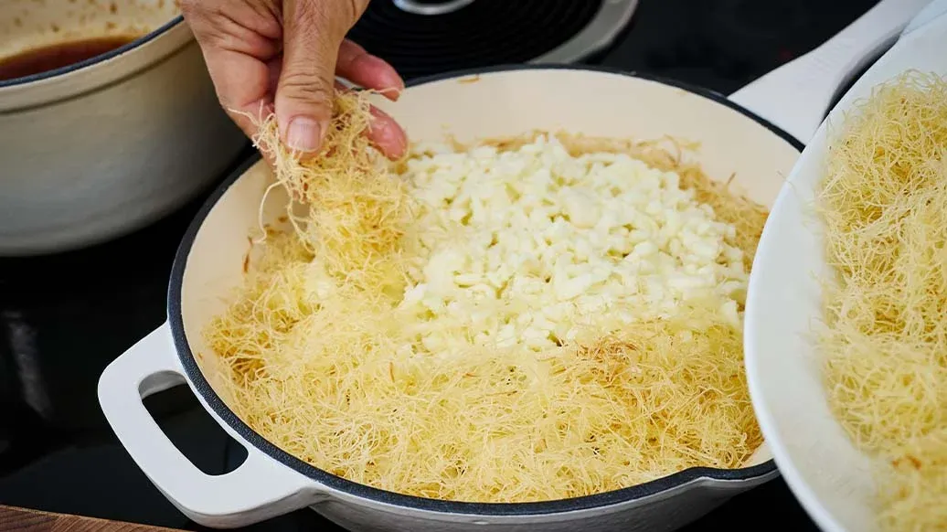 Rozpuść masło, a następnie dokładnie wymieszaj z kadayif, aż ciasto równomiernie pokryje się masłem.