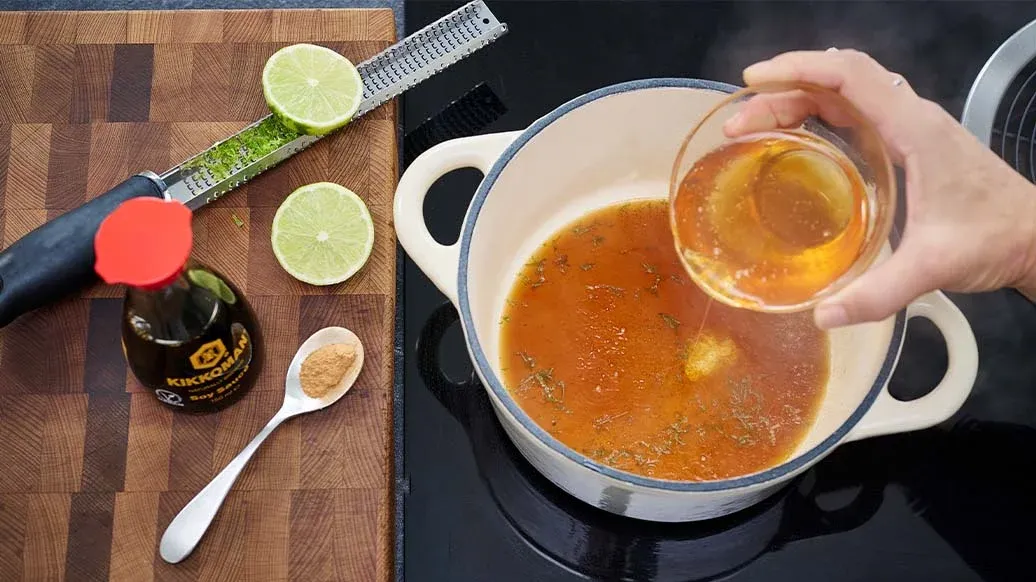 Drobno zetrzyj skórkę z limonki. Limonkę przekrój na pół i wyciśnij sok. Skórkę i sok umieść w małym rondelku wraz z miodem, Sosem sojowym Kikkoman, cynamonem i około 75 ml wody. Gotuj na wolnym ogniu przez 3-5 minut, a następnie dodaj wodę różaną, jeśli chcesz.