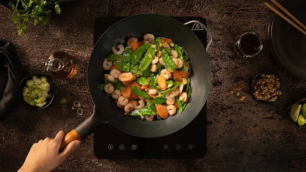 Rozgrzej olej w woku, dodaj krewetki i smaż przez 2 minuty. Wyjmij je i przełóż na talerz. Dymkę, groszek cukrowy i marchewkę smaż w woku przez 3 minuty. Dopraw Olejem sezamowym Kikkoman i smaż przez kolejne 2 minuty.