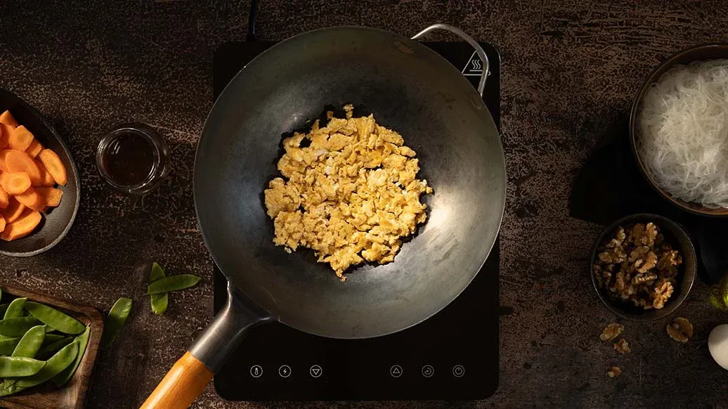 Wbij jajka do miski i ubij je z Sosem do woka Teriyaki z czosnkiem Kikkoman. Rozgrzej olej w gorącym woku i smaż jajka przez około 3 minuty, mieszając, aż powstanie miękka jajecznica. Przełóż na talerz i wytrzyj woka ręcznikiem papierowym.
