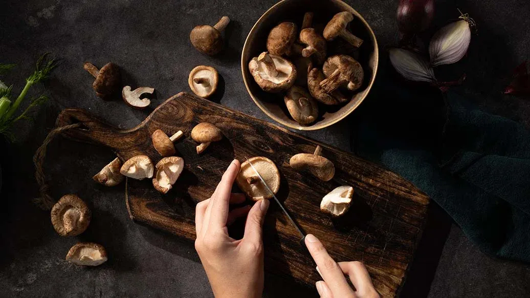 Rozgrzej olej w dużym woku. Smaż cebulę i koper włoski przez 3 minuty, często mieszając. Odetnij nóżki grzybów shiitake i przekrój większe na pół lub na ćwiartki. Dodaj do woka i smaż przez kolejne 2 minuty.