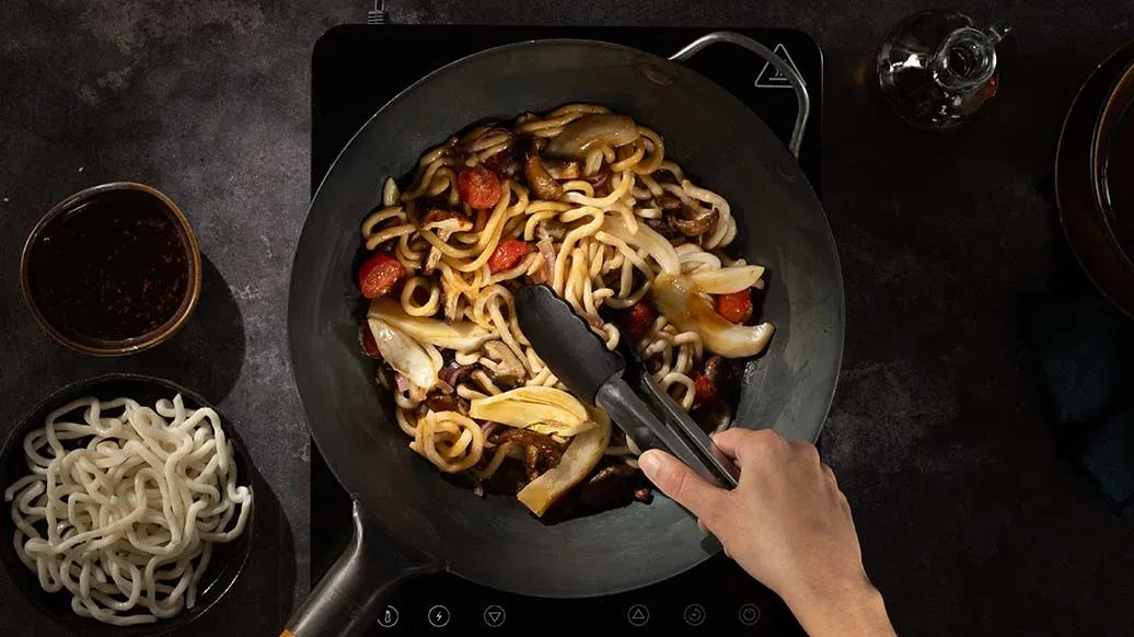 Makaron udon zanurz na krótko w misce z gorącą wodą, żeby się rozluźnił, a następnie wyjmij i przełóż do woka. Dodaj Sos do woka Teriyaki z sezamem Kikkoman i Olej sezamowy Kikkoman. Wymieszaj i smaż krótko, aż makaron ładnie się zeszkli.