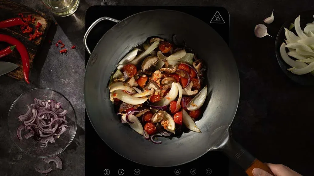 Do woka dodaj czosnek, chili, imbir i pomidory i smaż przez kolejne 2 minuty. Zdeglasuj wodą lub bulionem. Przykryj i gotuj na wolnym ogniu przez 5 minut.