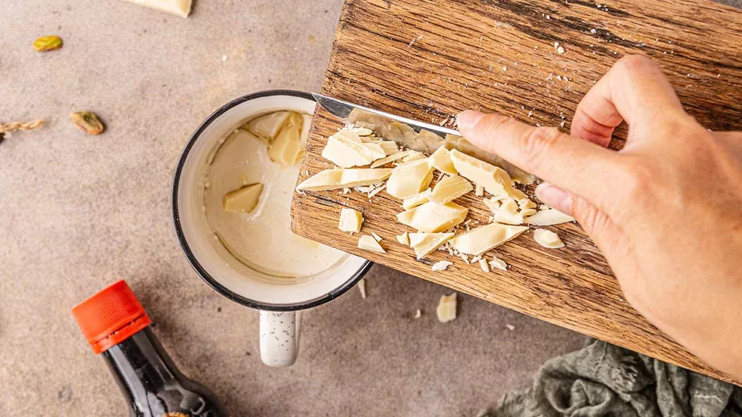 Do garnuszka wlej śmietankę i wsyp posiekaną czekoladę. Podgrzej i mieszaj do rozpuszczenia czekolady. Ostudź.