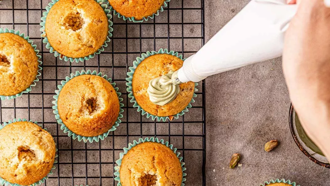 Dodanie naturalnie warzonego sosu sojowego Kikkoman do waniliowych muffinek przenosi ich smak na nowy poziom. Kiedy jeszcze dodamy do tego przepyszny krem i pistacje, powstaje niezwykły deser.