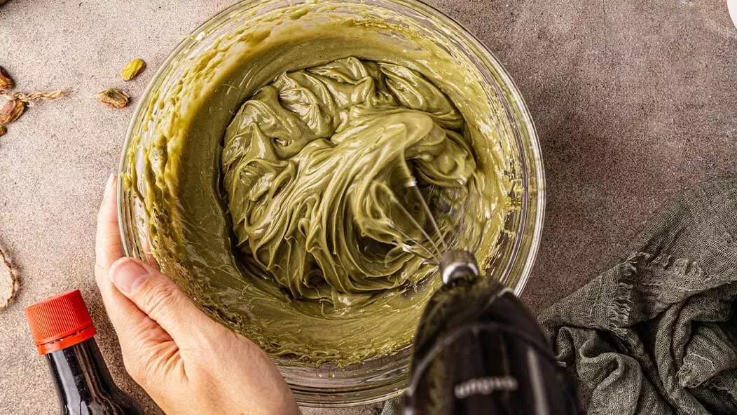 W misie miksera umieść pastę pistacjową, mascarpone oraz wystudzoną śmietankę z czekoladą. Ubij na puszystą masę.