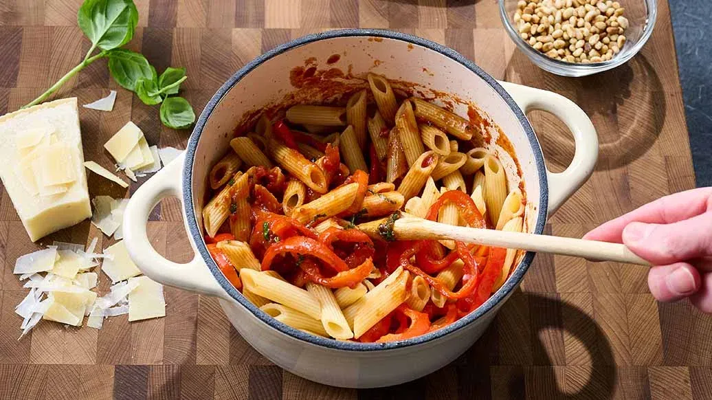 Wymieszaj makaron z sosem, pieczonymi paprykami i odrobiną wody z makaronu. Nałóż na talerze.