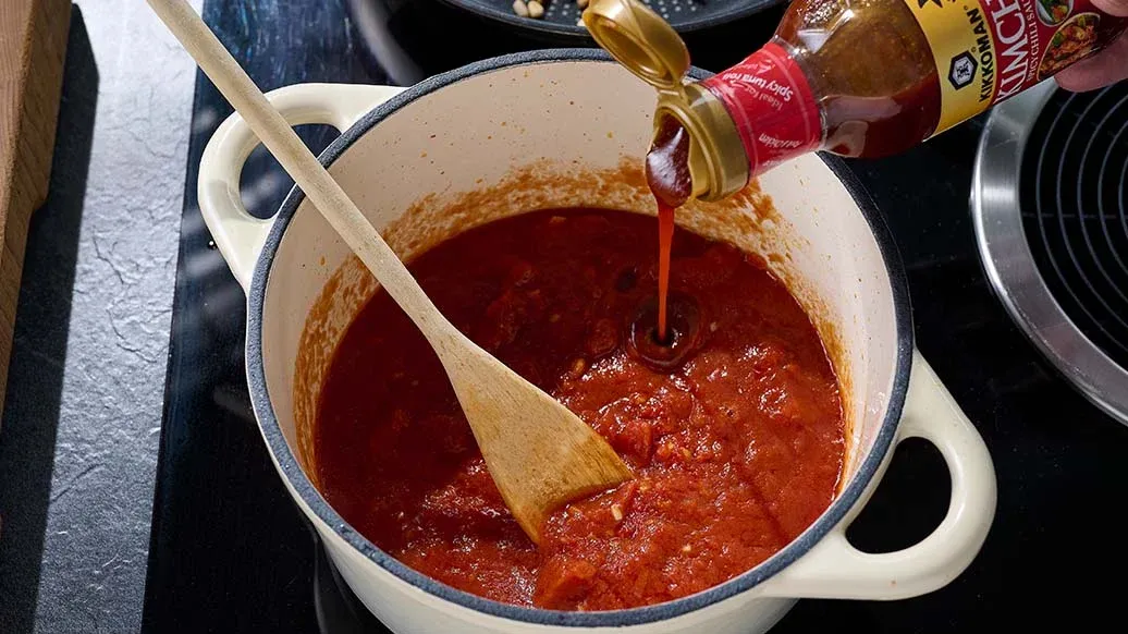 Klasyczne danie kuchni włoskiej z wyrazistym azjatyckim akcentem - makaron al dente w pikantnym sosie pomidorowym z Sosem sojowym Kikkoman i Sosem z chili do kimchi Kikkoman, posypany parmezanem i prażonymi orzeszkami piniowymi.