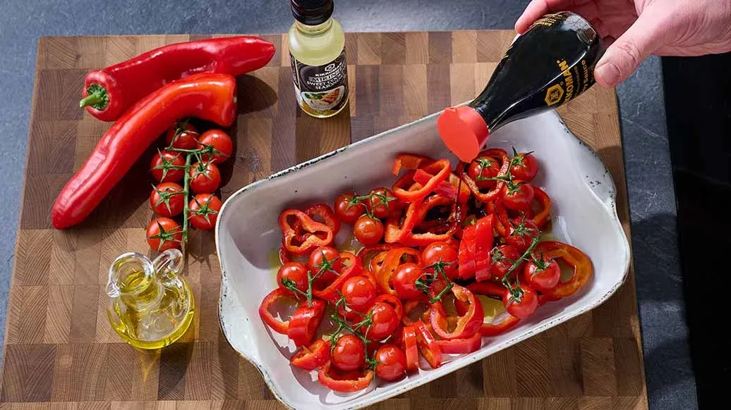 Rozgrzej piekarnik do 200°C. Paprykę pokrój w krążki. Wymieszaj z pomidorkami, oliwą, cukrem i Sosem sojowym Kikkoman. Rozłóż w małym naczyniu żaroodpornym i piecz w rozgrzanym piekarniku przez 10-15 minut, aż pomidory zaczną pękać.