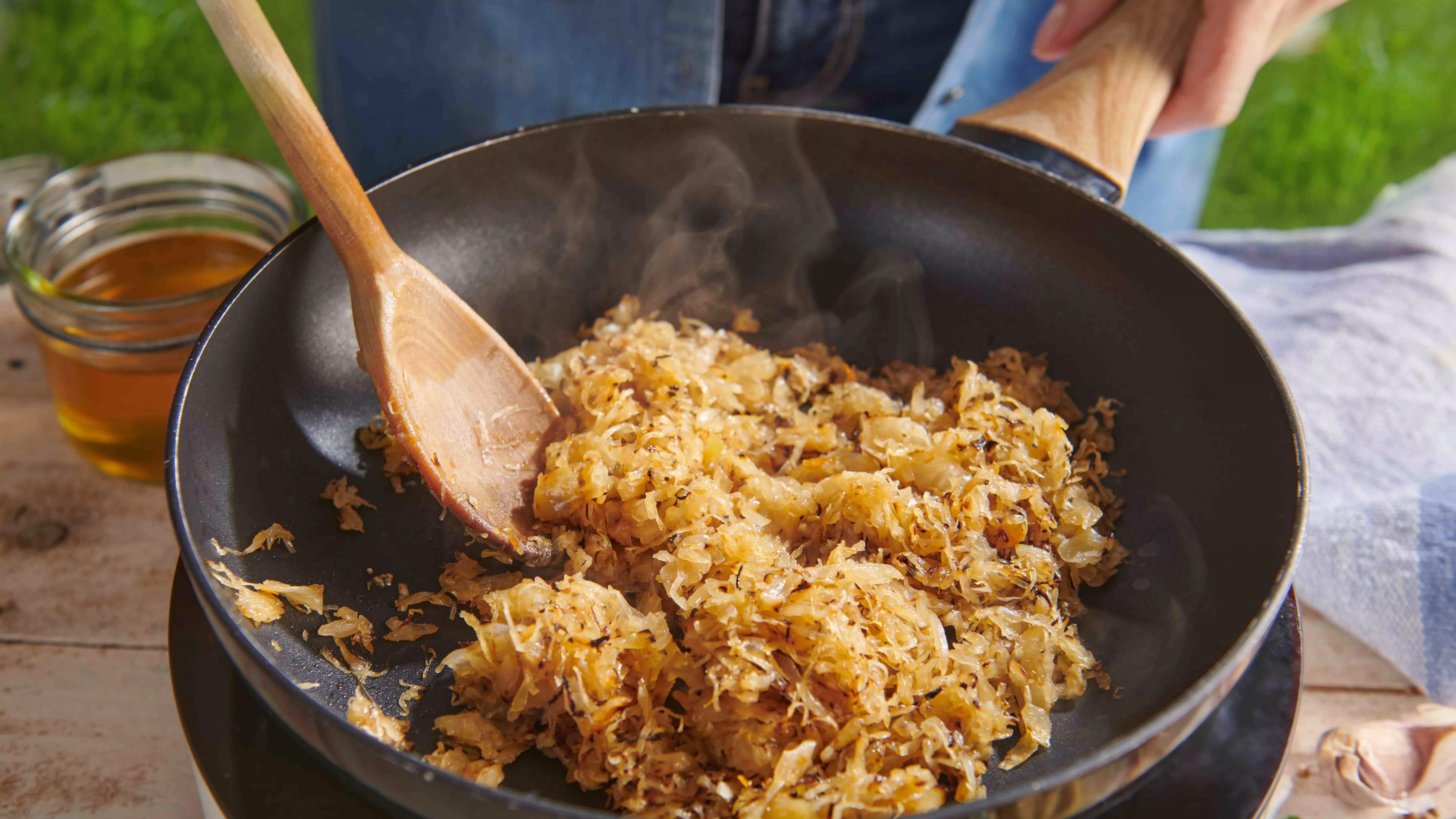 Kapustę kiszoną podsmaż z musztardą i odrobiną miodu.