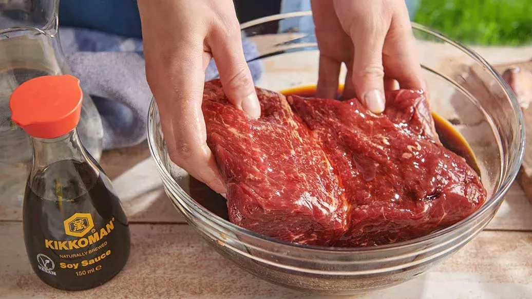 1 szklanka brązowego cukru – 250 ml Naturalnie warzony sos sojowy Kikkoman – 100 ml Słodka przyprawa w stylu mirin Kikkoman (na bazie fermentowanego ryżu) – 250 ml wody – 400 g rostbefu (lub mostka wołowego)
