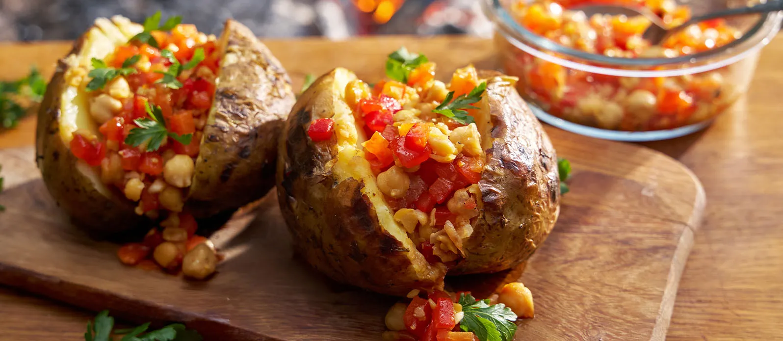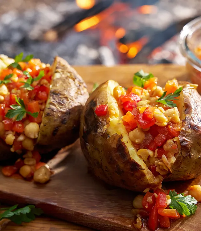 Pieczony ziemniak z ogniska z salsą z czerwonej papryki