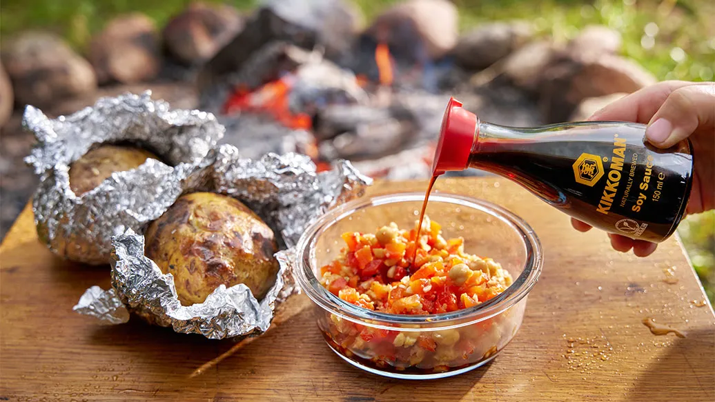 Pieczone w żarze ziemniaki o delikatnym, dymnym aromacie, z dodatkiem salsy z pieczonej czerwonej papryki, czosnku i ciecierzycy, doprawione do perfekcji Sosem sojowym Kikkoman.