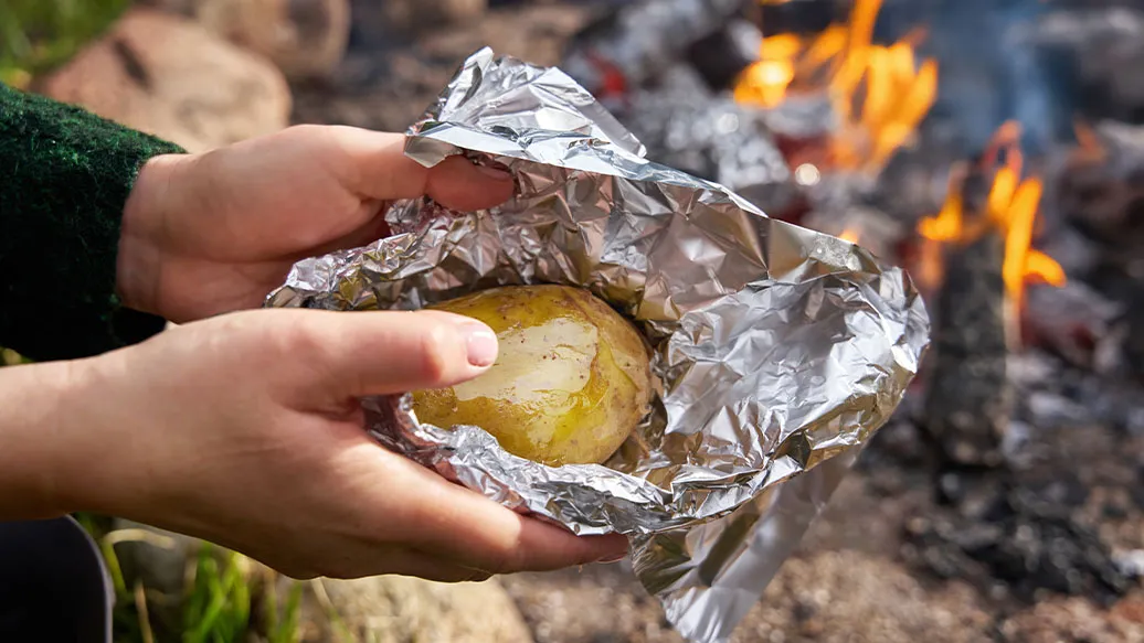 Ziemniaki skrop olejem, zawiń w folię aluminiową i zakop w żarze ogniska na około 40 minut.