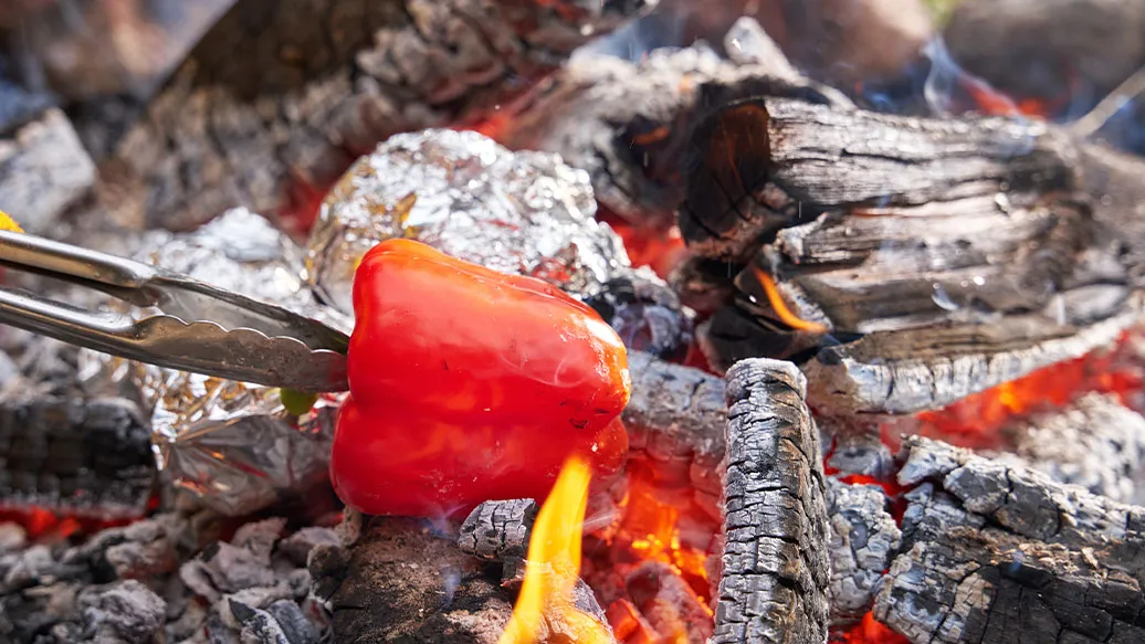Papryki upiecz nad ogniem, a następnie przełóż do miski i szczelnie przykryj. Odstaw na 10 minut przed zdjęciem skórki.